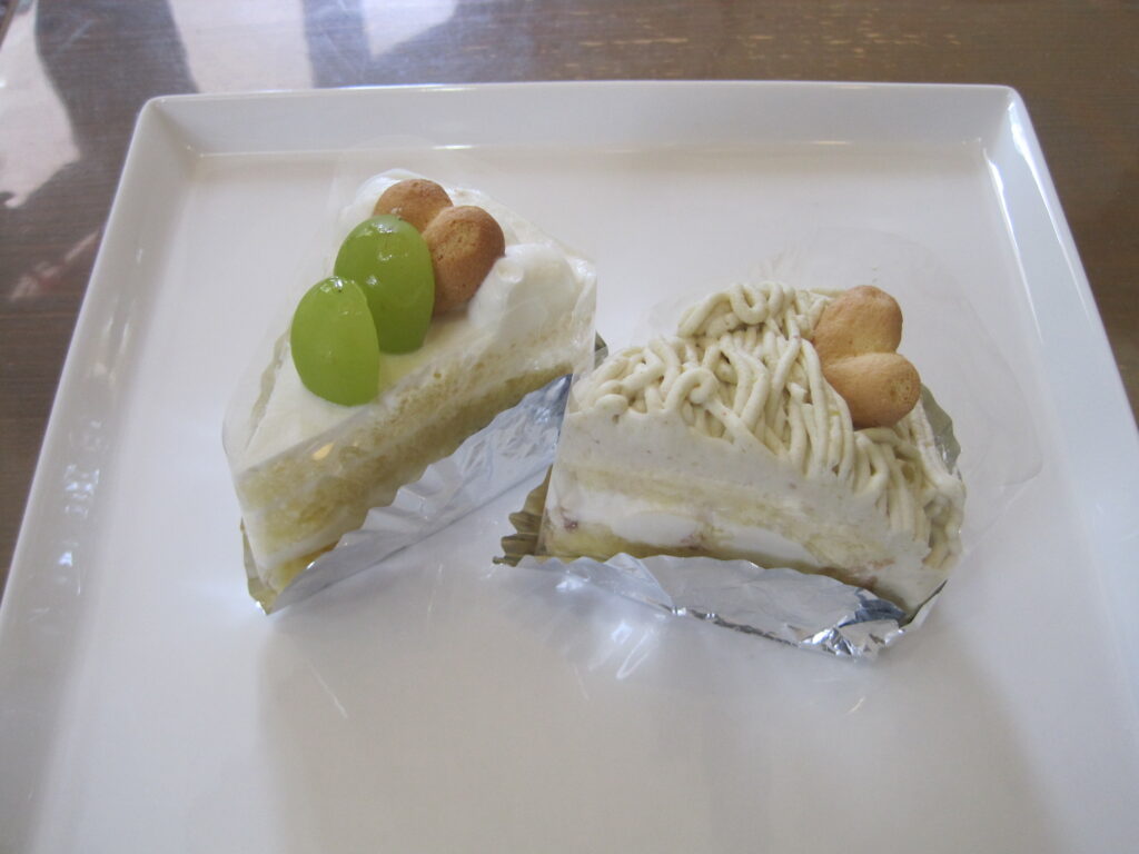 沼津ケーキ屋 ひなたぼっこ 今日のサービスケーキ”ホームページ見たよ(スマホの画面を見せていただいてもいいです)”と言ってくれたお客様で、今日のケーキ「モンブランパイ と シャインマスカットのショートケーキ」 をお買い上げの場合、今日のケーキ2種類、それぞれ1個につき50円引きとさせていただきます。何個でもいいで~す。今日のケーキは、毎日変わります