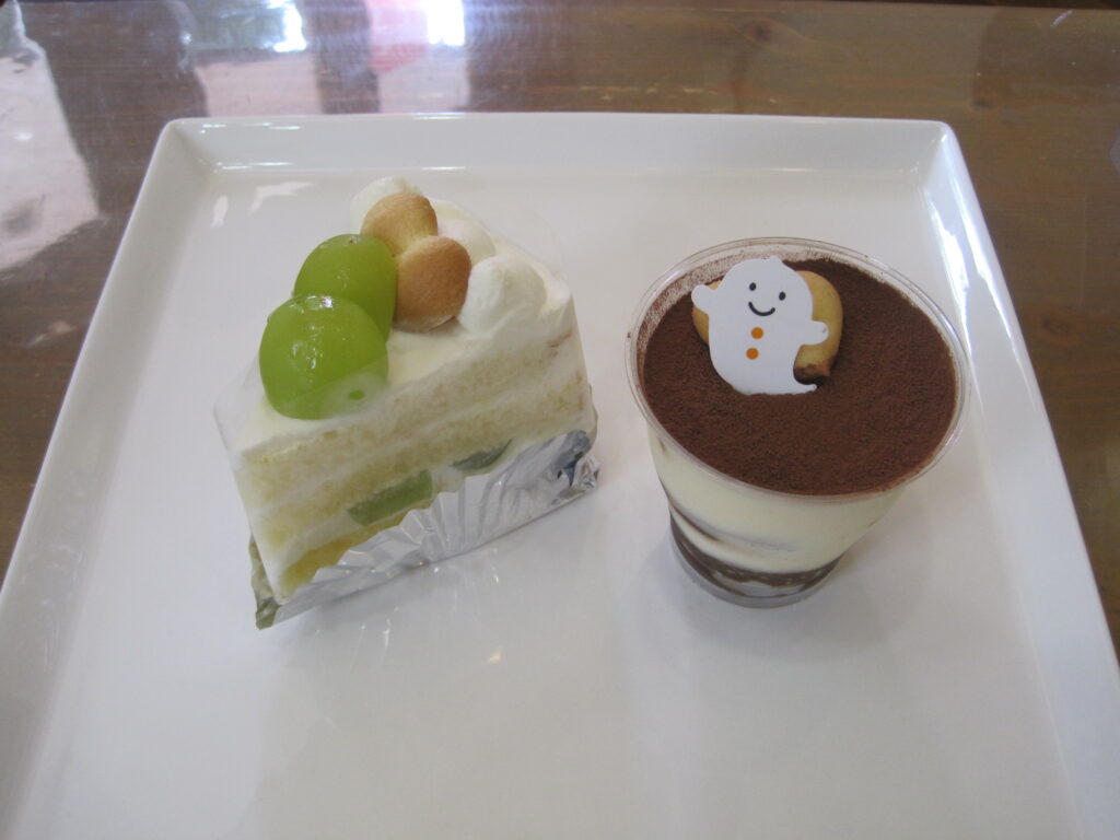 沼津ケーキ屋 ひなたぼっこ 今日のサービスケーキ”ホームページ見たよ(スマホの画面を見せていただいてもいいです)”と言ってくれたお客様で、今日のケーキ「シャインマスカットのショートケーキ と ティラミス」 をお買い上げの場合、今日のケーキ2種類、それぞれ1個につき50円引きとさせていただきます。何個でもいいで~す。今日のケーキは、毎日変わります。
