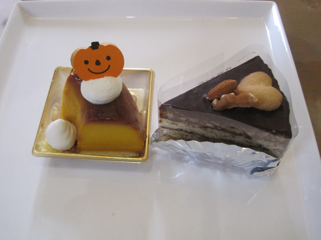 沼津ケーキ屋 ひなたぼっこ 今日のサービスケーキ”ホームページ見たよ(スマホの画面を見せていただいてもいいです)”と言ってくれたお客様で、今日のケーキ「チョコレートケーキ と かぼちゃのプリン」 をお買い上げの場合、今日のケーキ2種類、それぞれ1個につき50円引きとさせていただきます。何個でもいいで~す。今日のケーキは、毎日変わります。