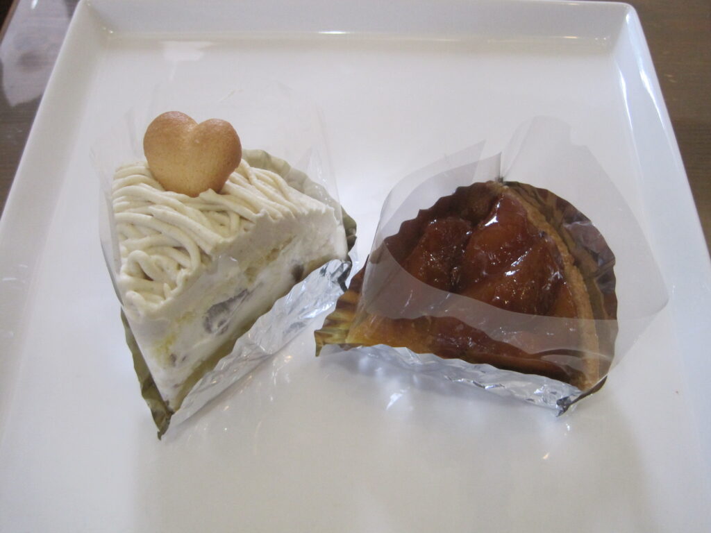 沼津ケーキ屋 ひなたぼっこ 今日のサービスケーキ”ホームページ見たよ(スマホの画面を見せていただいてもいいです)”と言ってくれたお客様で、今日のケーキ「タルトタタン と モンブランパイ」 をお買い上げの場合、今日のケーキ2種類、それぞれ1個につき50円引きとさせていただきます。何個でもいいで~す。今日のケーキは、毎日変わります。