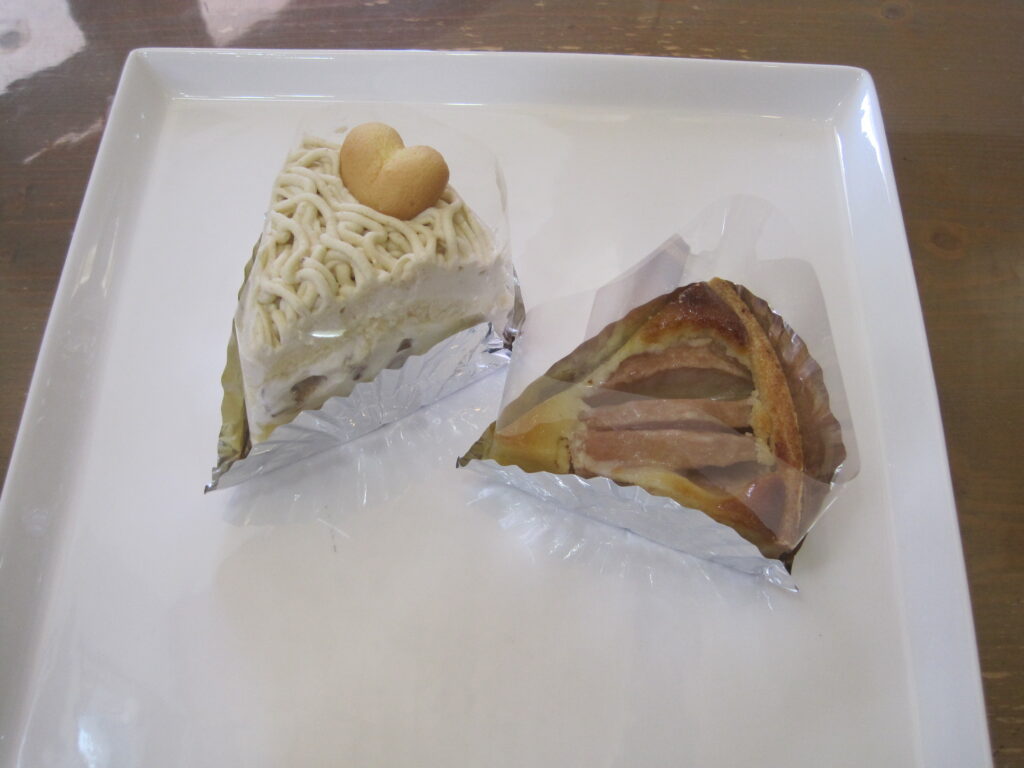 沼津ケーキ屋 ひなたぼっこ 今日のサービスケーキ”ホームページ見たよ(スマホの画面を見せていただいてもいいです)”と言ってくれたお客様で、今日のケーキ「ラフランスのタルト と モンブランパイ」 をお買い上げの場合、今日のケーキ2種類、それぞれ1個につき50円引きとさせていただきます。何個でもいいで~す。今日のケーキは、毎日変わります。