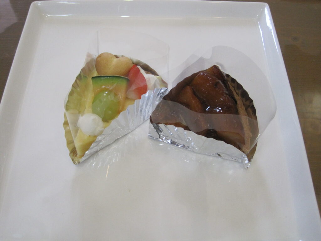 沼津ケーキ屋 ひなたぼっこ 今日のサービスケーキ”ホームページ見たよ(スマホの画面を見せていただいてもいいです)”と言ってくれたお客様で、今日のケーキ「フルーツタルト と タルトタタン」 をお買い上げの場合、今日のケーキ2種類、それぞれ1個につき50円引きとさせていただきます。何個でもいいで~す。今日のケーキは、毎日変わります。