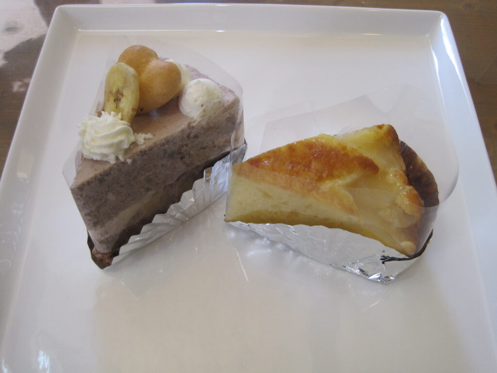 沼津ケーキ屋 ひなたぼっこ 今日のサービスケーキ”ホームページ見たよ(スマホの画面を見せていただいてもいいです)”と言ってくれたお客様で、今日のケーキ「チョコバナナケーキ と 洋ナシのケーキ」 をお買い上げの場合、今日のケーキ2種類、それぞれ1個につき50円引きとさせていただきます。何個でもいいで~す。今日のケーキは、毎日変わります。