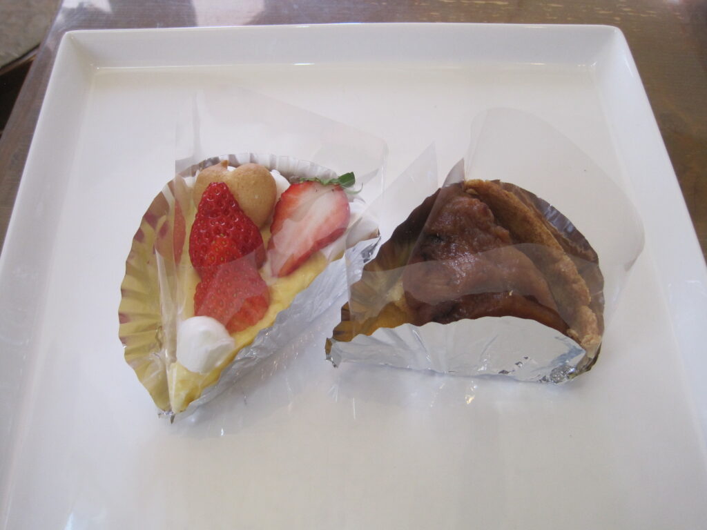 沼津ケーキ屋 ひなたぼっこ 今日のサービスケーキ”ホームページ見たよ(スマホの画面を見せていただいてもいいです)”と言ってくれたお客様で、今日のケーキ「タルトタタン と イチゴタルト」 をお買い上げの場合、今日のケーキ2種類、それぞれ1個につき50円引きとさせていただきます。何個でもいいで~す。今日のケーキは、毎日変わります。