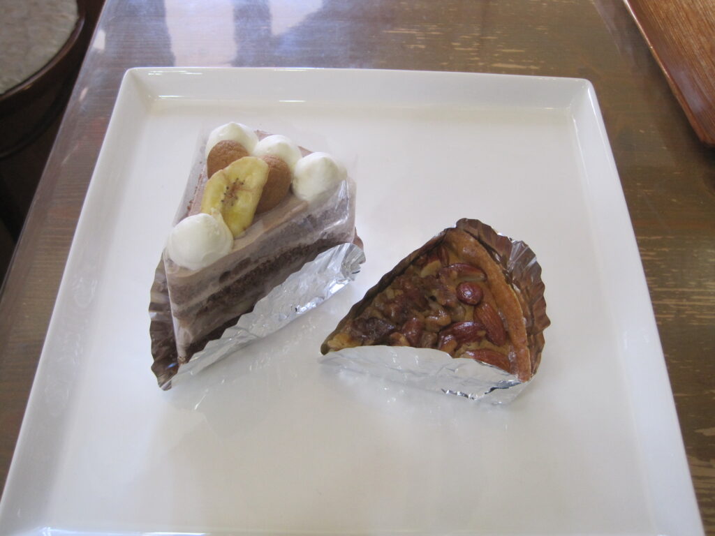 沼津ケーキ屋 ひなたぼっこ 今日のサービスケーキ”ホームページ見たよ(スマホの画面を見せていただいてもいいです)”と言ってくれたお客様で、今日のケーキ「チョコバナナケーキ と クルミのタルト」 をお買い上げの場合、今日のケーキ2種類、それぞれ1個につき50円引きとさせていただきます。何個でもいいで~す。今日のケーキは、毎日変わります。