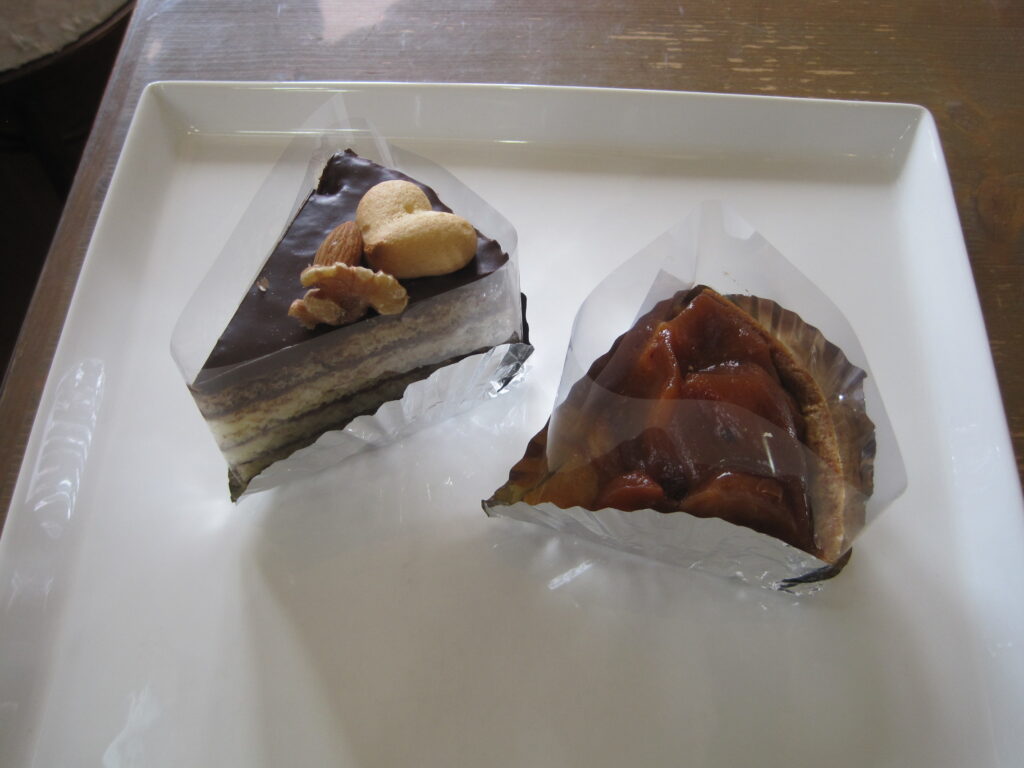 沼津ケーキ屋 ひなたぼっこ 今日のサービスケーキ”ホームページ見たよ(スマホの画面を見せていただいてもいいです)”と言ってくれたお客様で、今日のケーキ「タルトタタン と チョコレートケーキ」 をお買い上げの場合、今日のケーキ2種類、それぞれ1個につき50円引きとさせていただきます。何個でもいいで~す。今日のケーキは、毎日変わります。