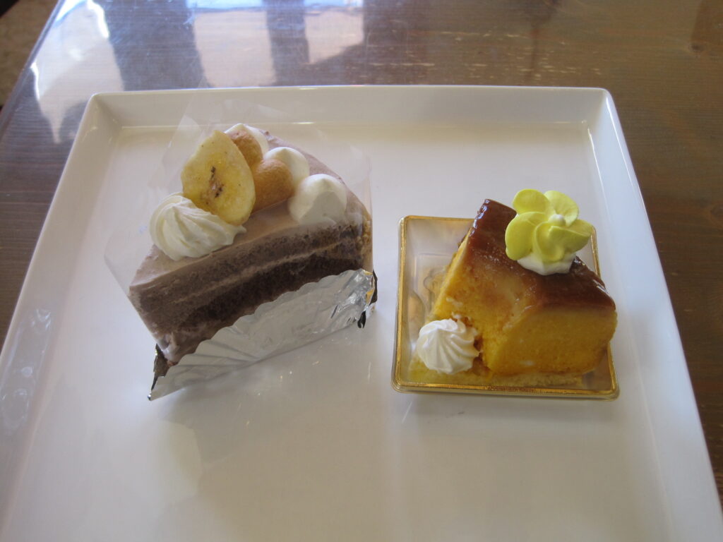 沼津ケーキ屋 ひなたぼっこ 今日のサービスケーキ”ホームページ見たよ(スマホの画面を見せていただいてもいいです)”と言ってくれたお客様で、今日のケーキ「かぼちゃのプリン と チョコバナナケーキ」 をお買い上げの場合、今日のケーキ2種類、それぞれ1個につき50円引きとさせていただきます。何個でもいいで~す。今日のケーキは、毎日変わります。