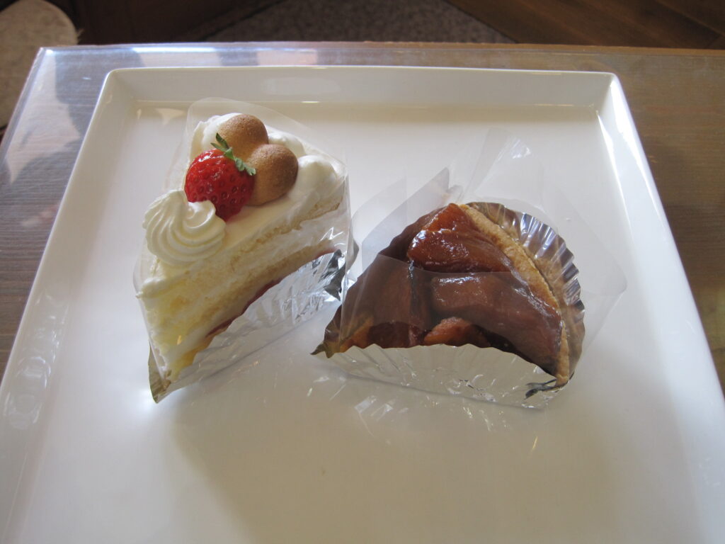 沼津ケーキ屋 ひなたぼっこ 今日のサービスケーキ”ホームページ見たよ(スマホの画面を見せていただいてもいいです)”と言ってくれたお客様で、今日のケーキ「イチゴのショートケーキ と タルトタタン」 をお買い上げの場合、今日のケーキ2種類、それぞれ1個につき50円引きとさせていただきます。何個でもいいで~す。今日のケーキは、毎日変わります。