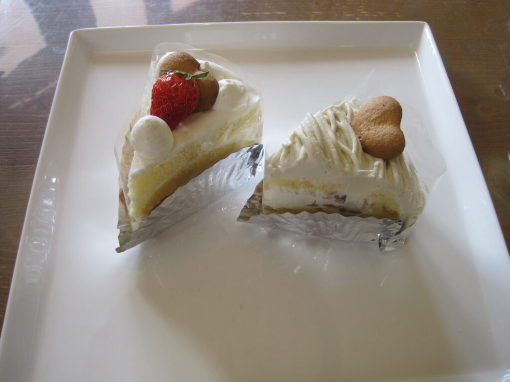 沼津ケーキ屋 ひなたぼっこ 今日のサービスケーキ”ホームページ見たよ(スマホの画面を見せていただいてもいいです)”と言ってくれたお客様で、今日のケーキ「イチゴのショートケーキ と モンブランパイ」 をお買い上げの場合、今日のケーキ2種類、それぞれ1個につき50円引きとさせていただきます。何個でもいいで~す。今日のケーキは、毎日変わります。
