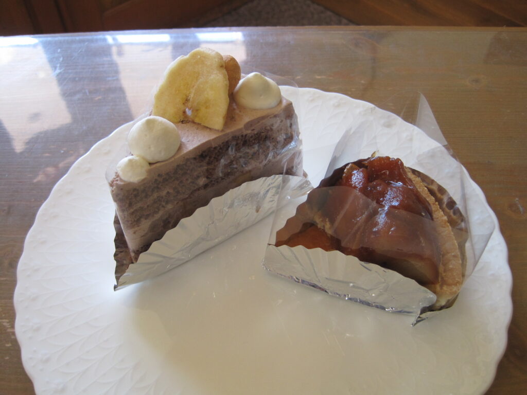 沼津ケーキ屋 ひなたぼっこ 今日のサービスケーキ”ホームページ見たよ(スマホの画面を見せていただいてもいいです)”と言ってくれたお客様で、今日のケーキ「チョコバナナケーキ と タルトタタン」 をお買い上げの場合、今日のケーキ2種類、それぞれ1個につき50円引きとさせていただきます。何個でもいいで~す。今日のケーキは、毎日変わります。