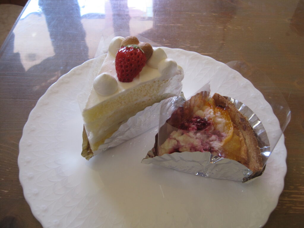 沼津ケーキ屋 ひなたぼっこ 今日のサービスケーキ”ホームページ見たよ(スマホの画面を見せていただいてもいいです)”と言ってくれたお客様で、今日のケーキ「イチゴのショートケーキ と 桃とキイチゴのタルト」 をお買い上げの場合、今日のケーキ2種類、それぞれ1個につき50円引きとさせていただきます。何個でもいいで~す。今日のケーキは、毎日変わります。