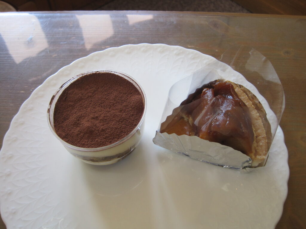 沼津ケーキ屋 ひなたぼっこ 今日のサービスケーキ”ホームページ見たよ(スマホの画面を見せていただいてもいいです)”と言ってくれたお客様で、今日のケーキ「タルトタタン と ティラミス」 をお買い上げの場合、今日のケーキ2種類、それぞれ1個につき50円引きとさせていただきます。何個でもいいで~す。今日のケーキは、毎日変わります。