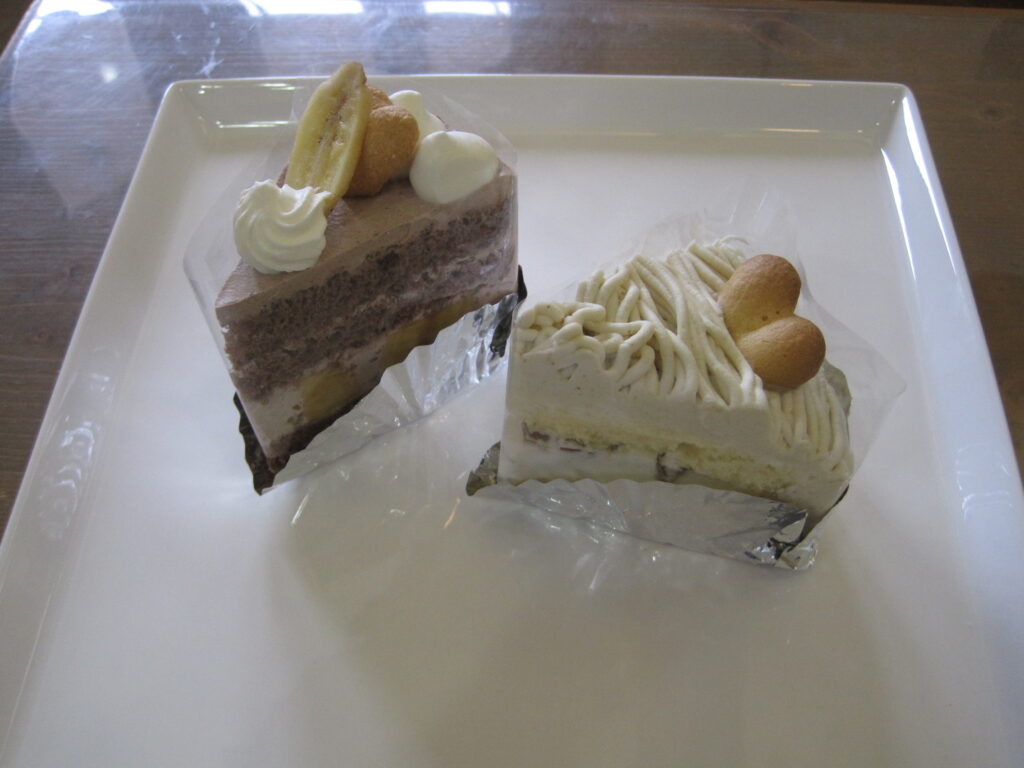 沼津ケーキ屋 ひなたぼっこ 今日のサービスケーキ”ホームページ見たよ(スマホの画面を見せていただいてもいいです)”と言ってくれたお客様で、今日のケーキ「モンブランパイ と チョコバナナケーキ」 をお買い上げの場合、今日のケーキ2種類、それぞれ1個につき50円引きとさせていただきます。何個でもいいで~す。今日のケーキは、毎日変わります。