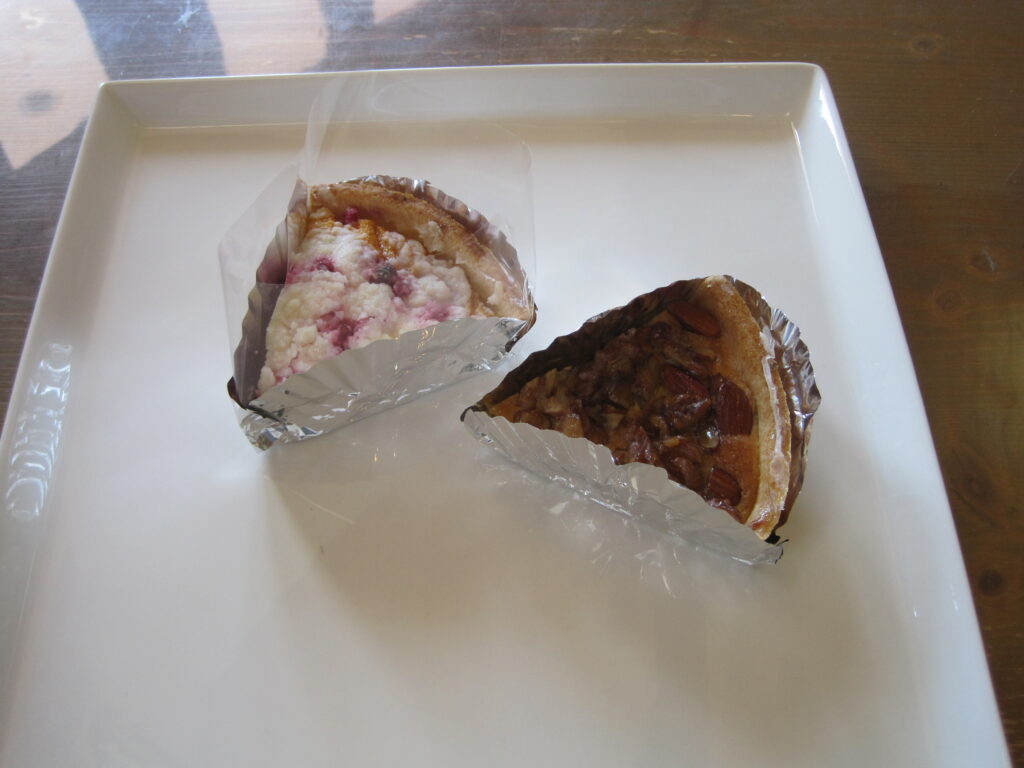 沼津ケーキ屋 ひなたぼっこ 今日のサービスケーキ”ホームページ見たよ(スマホの画面を見せていただいてもいいです)”と言ってくれたお客様で、今日のケーキ「桃とキイチゴのタルト と クルミのタルト」 をお買い上げの場合、今日のケーキ2種類、それぞれ1個につき50円引きとさせていただきます。何個でもいいで~す。今日のケーキは、毎日変わります。