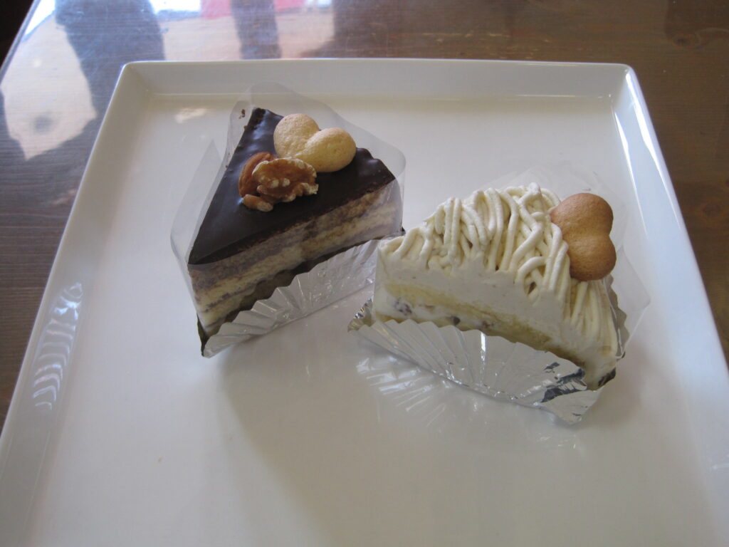 沼津ケーキ屋 ひなたぼっこ 今日のサービスケーキ”ホームページ見たよ(スマホの画面を見せていただいてもいいです)”と言ってくれたお客様で、今日のケーキ「チョコレートケーキ と モンブランパイ」 をお買い上げの場合、今日のケーキ2種類、それぞれ1個につき50円引きとさせていただきます。何個でもいいで~す。今日のケーキは、毎日変わります。