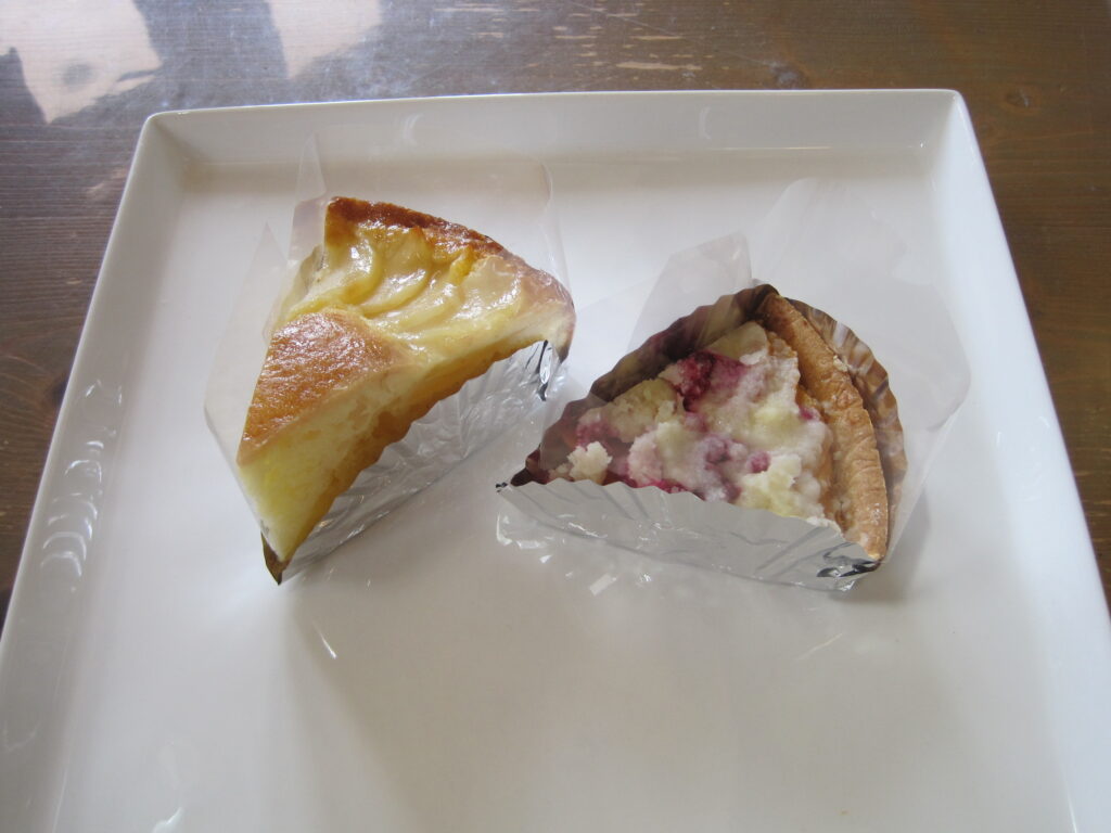 沼津ケーキ屋 ひなたぼっこ 今日のサービスケーキ”ホームページ見たよ(スマホの画面を見せていただいてもいいです)”と言ってくれたお客様で、今日のケーキ「洋ナシのケーキ と 桃とキイチゴのタルト」 をお買い上げの場合、今日のケーキ2種類、それぞれ1個につき50円引きとさせていただきます。何個でもいいで~す。今日のケーキは、毎日変わります。