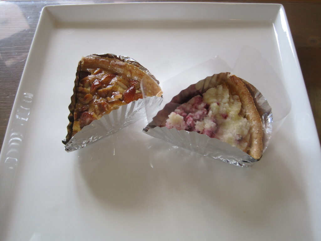 沼津ケーキ屋 ひなたぼっこ 今日のサービスケーキ”ホームページ見たよ(スマホの画面を見せていただいてもいいです)”と言ってくれたお客様で、今日のケーキ「桃とキイチゴのタルト と クルミのタルト」 をお買い上げの場合、今日のケーキ2種類、それぞれ1個につき50円引きとさせていただきます。何個でもいいで~す。今日のケーキは、毎日変わります。